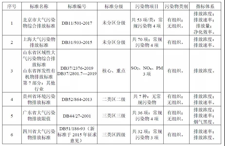 国家大气污染物综合排放标准(GB16297-1996)发布于1996年,1997年开始实施,标准较老,标准限值均较松。全国已有广东省、山东省、贵州省、四川省等省份均已制定了地方综合排放标准,如下表所示