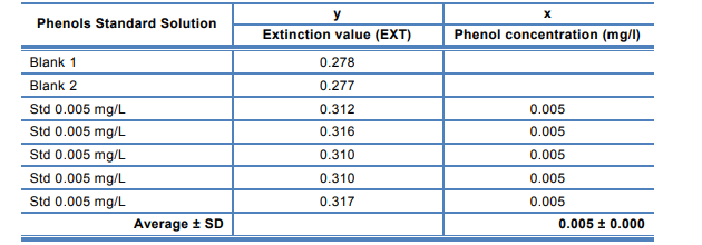 实验结果:将滤液转移到50mm的玻璃试管中,在460 nm处对蒸馏水读出消光值。苯酚浓度采用校准曲线方程计算:y = 19.676 x + 0.22